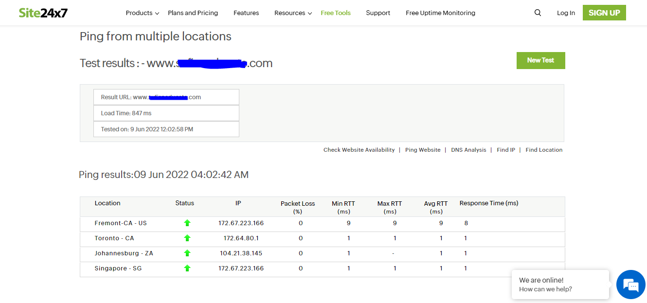 As shown in the image, you may quickly ping your domain name on the Site 24×7.